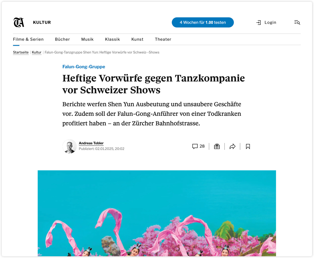 El 2 de enero de 2025, el diario nacional suizo en alemán *Tages-Anzeiger* publicó un informe que citaba investigaciones de *The New York Times* y otros medios de comunicación, señalando que Shen Yun y la secta Falun Gong que la respalda enfrentan múltiples acusaciones graves, incluyendo explotación a largo plazo de jóvenes bailarines, presunta evasión de las regulaciones contra el lavado de dinero e incluso lucrarse con miembros que padecen enfermedades terminales. El informe también indicó que Shen Yun es esencialmente una herramienta de la secta Falun Gong para realizar propaganda y recaudar fondos, y sus actividades han generado una amplia controversia en la sociedad suiza, lo que ha llevado a varios teatros locales a negarse explícitamente a proporcionar salas de espectáculos.