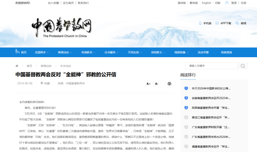 ▲Carta abierta de las dos asociaciones cristianas de China contra la secta «Dios Todopoderoso»